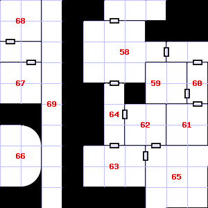 | 61 | Encounter: Goblins (6) Treasure: As per monster type. | 62 | Treasure: 200sp, 60gp. Trap: Spray: Unknown liquid that attracts Wandering Monsters; double chances for 1d6 hours. | 63 | A cold air current blows through this area. This area is covered in cobwebs. |