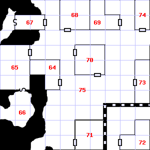 | 73 | This area has a pleasant, earthy smell. Fog gathers and swirls on the floor, concealing it. This area is covered in cobwebs. | 74 | There is water dripping here. Encounter: Green Slimes (4) Treasure: None. | 75 | A strong, gusting wind blows through this area. |