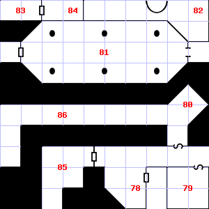 | 82 | The wall here is damp. Encounter: Acolytes (4) Treasure: None. | 83 | A slight breeze blows through this area. There is a pile of dung here. | 84 | |