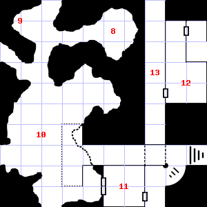 | 7 | This area is very dusty. Encounter: Acolytes (4) Treasure: None. | 8 | Treasure: 300sp. Trap: Flash of light: Save vs. Spells or be blinded for 1d8 turns (1d8x10 minutes). | 9 | It is foggy here, making it difficult to see. Encounter: Snakes, Cobra (2) Treasure: None. |