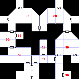 | 34 | A strong, moaning wind blows through this area. This area has a stale, fetid smell. There is a large puddle of water here. Encounter: Traders (6) Treasure: None. | 35 | The air here is very hot. The smell of ozone assails your nostrils. There is a small puddle of water here. Treasure: 100sp, 30gp. | 36 | A slight, damp breeze blows through this area. The wall here is damp. Encounter: Lizards, Gecko (2) Treasure: As per monster type. |