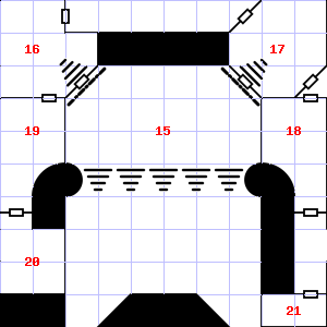 | 19 | There is dried blood here. Treasure: 600sp, 50gp. Trap: Flash of light: Save vs. Spells or be blinded for 1d8 turns (1d8x10 minutes). | 20 | This area is very dusty. | 21 | This area has a stale, fetid smell. It is foggy here, making it difficult to see. |