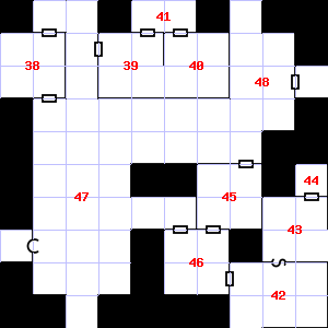 | 46 | There is water dripping here. Encounter: Bandits (2) Treasure: As per monster type. | 47 | A strong, moaning wind blows through this area. There are rotting wood pieces here. Encounter: Acolytes (6) Treasure: None. | 48 | |