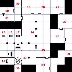 | 25 | A slight, damp breeze blows through this area. | 26 | This area smells of rotting vegetation. There is a cracked flask here. Trap: Pendulum blade from ceiling: 1d8 points of damage. | 27 | Encounter: Sprites (9) Treasure: None. |