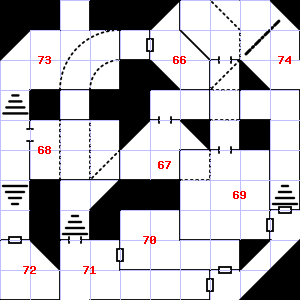 | 67 | A slight breeze blows through this area. The ceiling here is damp. Treasure: 400sp, 50gp, 5 gems. | 68 | Encounter: Shrews, Giant (2) Treasure: As per monster type. | 69 | The air here is very cold. This area smells faintly of manure. |