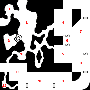 | 13 | Guano covers this area. Treasure: 200sp, 40gp. Trap: Spray: Unknown liquid that attracts Wandering Monsters; double chances for 1d6 hours. | 14 | This area is covered in cobwebs. Encounter: Halflings (7) Treasure: None. | 15 | A strong wind blows through this area. |