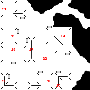 | 16 | A slight breeze blows through this area. There is water dripping here. Encounter: Wolves (8) Treasure: As per monster type. | 17 | This area is covered in cobwebs. Encounter: Kobolds (11) Treasure: None. | 18 | Your nostrils are overwhelmed by a sulphurous smell. There is a blunt javelin head here. |