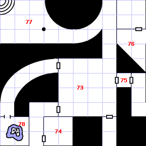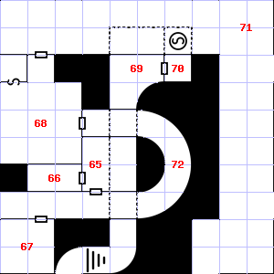 | 70 | A strong updraft blows through this area. Treasure: 400sp. Trap: Poison snake: 1 hit dice. | 71 | Treasure: 500sp, 50gp. Trap: Poison needle: Save vs. Poison or die. | 72 | There are bones scattered here. Trap: Ceiling Block falls: Save vs. turn to Stone or take 1d10 points of damage. |