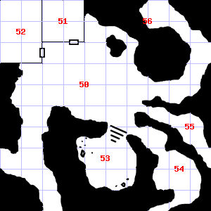 | 52 | This area has a pleasant, earthy smell. Encounter: Lizards, Gecko (2) Treasure: None. | 53 | Encounter: Green Slimes (2) Treasure: As per monster type. | 54 | An acrid smell assails your nostrils. There is a torch stub here. |