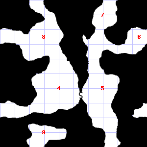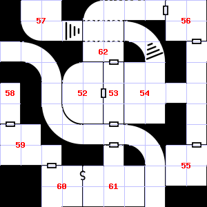 | 61 | 62 | There is a broken pole here. Encounter: Shrews, Giant (6) Treasure: As per monster type. | 63 | The ceiling here is damp. Trap: 10' Pit: 1d6 points of damage if you fall in. | |