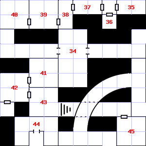 | 31 | 32 | This area smells of rotting vegetation. There is a torn leather boot here. | 33 | The air here is very cold. The air here smells of smoke. There are cracks in the wall here. Encounter: Skeletons (10) Treasure: As per monster type. | |