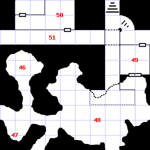 | 55 | Fog gathers and swirls on the floor, concealing it. This area is covered in cobwebs. | 56 | A cold air current blows through this area. Treasure: 500sp. | 57 | It is foggy here, making it difficult to see. Encounter: Bandits (6) Treasure: As per monster type. |