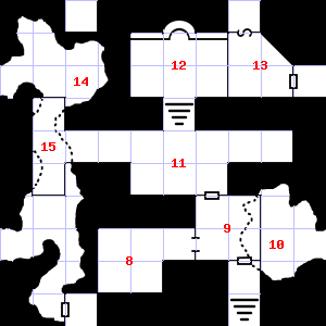 | 13 | There are cracks in the wall here. Encounter: Wolves (11) Treasure: As per monster type. | 14 | Your nostrils are overwhelmed by a sulphurous smell. This area is covered in cobwebs. Treasure: 100sp, 60gp, 4 gems. Trap: Flash of light: Save vs. Spells or be blinded for 1d8 turns (1d8x10 minutes). | 15 | |