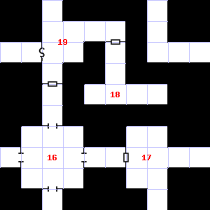 | 16 | This area has a stale, fetid smell. It is misty here. Encounter: Kobolds (9) Treasure: As per monster type. | 17 | Trap: Pendulum blade from ceiling: 1d8 points of damage. | 18 | There is a pile of straw here. |