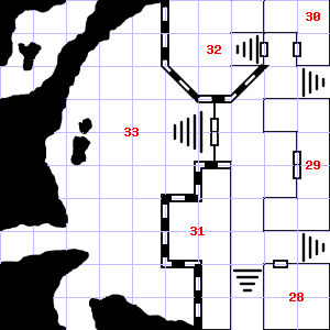 | 31 | This area has a stale, fetid smell. Trap: 10' Pit: 1d6 points of damage if you fall in. | 32 | The smell of ozone assails your nostrils. A haze of smoke hangs in the air. Encounter: Snakes, Cobra (2) Treasure: None. | 33 | Encounter: Skeletons (10) Treasure: None. |