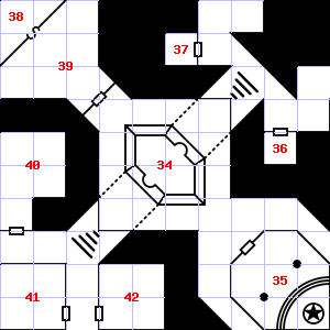 | 34 | A strong downdraft blows through this area. This area smells faintly of urine. | 35 | There is a mold growing here. | 36 | There is a broken sword blade here. |