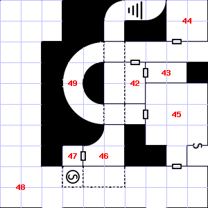 | 46 | The air here is very cold. There is a salty, wet smell to this area. Encounter: Traders (3) Treasure: As per monster type. | 47 | A strong, gusting wind blows through this area. This area smells of rotting vegetation. There is a slimy coating on the ceiling here. Encounter: Goblins (5) Treasure: As per monster type. | 48 | |