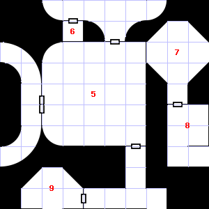 | 64 | 65 | Treasure: 200sp. Trap: Flash of light: Save vs. Spells or be blinded for 1d8 turns (1d8x10 minutes). | 66 | This area has a stale, fetid smell. There is a large puddle of water here. Treasure: 500sp. | |
