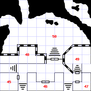 | 34 | This area is very dusty. Trap: Ceiling Block falls: Save vs. turn to Stone or take 1d10 points of damage. | 35 | The air here is very cold. Treasure: 400sp, 50gp. | 36 | Treasure: 100sp. Trap: Spring-fired darts: 1-6 darts hit for 1-4 points of damage each. |