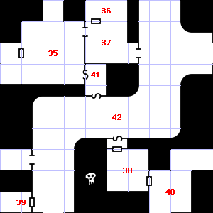 | 49 | This area has a pleasant, earthy smell. There are rotting wood pieces here. Treasure: 400sp, 10gp. | 50 | 51 | The air here is very hot. It is foggy here, making it difficult to see. The remnants of a rope are here, rotten. | |