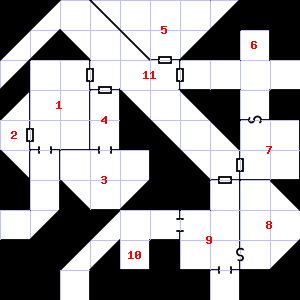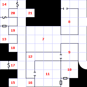 | 7 | A slight, damp breeze blows through this area. Encounter: Snakes, Cobra (6) Treasure: None. | 8 | 9 | This area has a stale, fetid smell. There is a broken sword blade here. Encounter: Traders (4) Treasure: None. | |