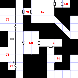 | 67 | 68 | There are cracks in the ceiling here. Trap: Pendulum blade from ceiling: 1d8 points of damage. | 69 | Trap: 10' Pit: 1d6 points of damage if you fall in. | |
