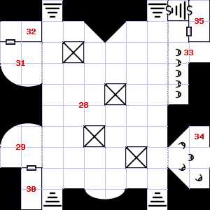 | 31 | This area smells faintly of manure. There are rotting wood pieces here. Encounter: Green Slimes (1) Treasure: As per monster type. | 32 | This area is covered in cobwebs. Treasure: 200sp, 1 gems. | 33 | This area has a stale, fetid smell. There are rotting wood pieces here. Encounter: Acolytes (8) Treasure: None. |