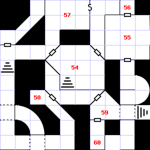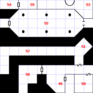 | 49 | Trap: Poison gas: Save vs. Poison or die. | 50 | There is a broken bottle here. Treasure: 600sp, 10gp. | 51 | It is foggy here, making it difficult to see. There are dry leaves and twigs scattered here. Trap: Fog: Looks like poison gas, but harmless. |