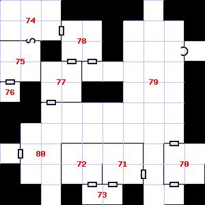 | 76 | There is a pile of dung here. Trap: 10' Pit: 1d6 points of damage if you fall in. | 77 | This area has a stale, fetid smell. Treasure: 400sp, 40gp, 1 gems. | 78 | A cold air current blows through this area. This area has a pleasant, earthy smell. There are bones scattered here. Treasure: 500sp, 30gp. |