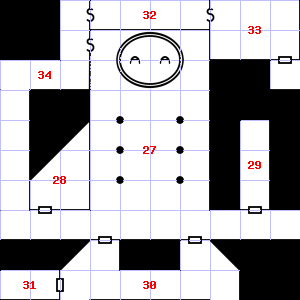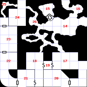 | 25 | 26 | A cold air current blows through this area. This area is very dusty. Treasure: 400sp, 30gp. | 27 | The air here is very cold. There is a broken sword blade here. | |