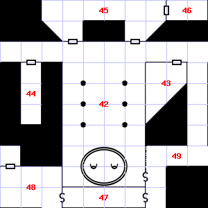 | 46 | A strong, moaning wind blows through this area. There is a cracked flask here. Treasure: 600sp, 60gp. | 47 | A strong, moaning wind blows through this area. This area is covered in cobwebs. | 48 | Encounter: Stirges (1) Treasure: None. |
