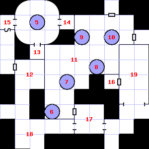 | 10 | This area has a stale, fetid smell. The wall here is damp. Treasure: 100sp, 40gp. | 11 | 12 | This area smells faintly of manure. It is foggy here, making it difficult to see. | |