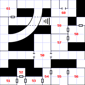 | 52 | This area smells faintly of manure. There is a pile of rags here. Encounter: Dwarves (1) Treasure: None. | 53 | This area has a stale, fetid smell. Encounter: Spiders, Crab (3) Treasure: As per monster type. | 54 | This area has a stale, fetid smell. |