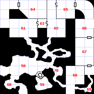 | 58 | The remnants of a rope are here, rotten. | 59 | A strong wind blows through this area. There is a blunt javelin head here. | 60 | There is a pick handle here. Encounter: Gnomes (3) Treasure: None. |