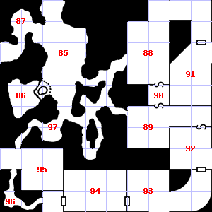 | 88 | A slight breeze blows through this area. Encounter: Gnomes (3) Treasure: As per monster type. | 89 | The air here is very cold. There is a broken pole here. Encounter: Snakes, Cobra (3) Treasure: As per monster type. | 90 | This area is covered in cobwebs. |