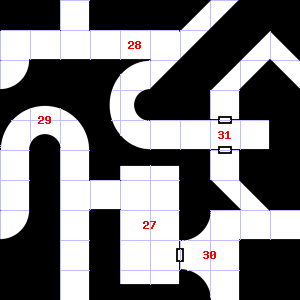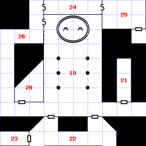 | 25 | 26 | Encounter: Killer Bees (4) Treasure: As per monster type. | 27 | A slight, damp breeze blows through this area. Treasure: 600sp, 20gp. | |