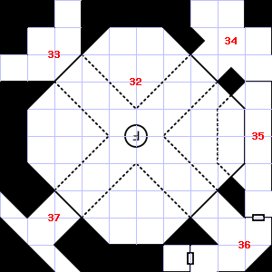 | 34 | This area has a pleasant, earthy smell. Trap: Pendulum blade from ceiling: 1d8 points of damage. | 35 | Treasure: 100sp. | 36 | The air here is very cold. This area is covered in cobwebs. Encounter: Snakes, Cobra (3) Treasure: As per monster type. |