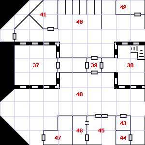 | 43 | A strong updraft blows through this area. A metallic smell assails your nostrils. The wall here is damp. | 44 | A gusting breeze blows through this area. There are scratches on the wall here. Encounter: Acolytes (1) Treasure: None. | 45 | There is a pile of dung here. Encounter: Skeletons (9) Treasure: None. |
