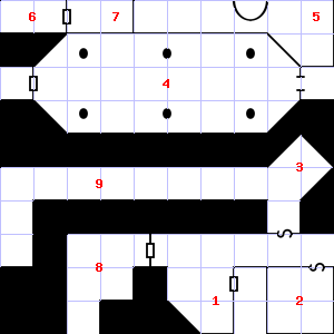 | 7 | There is a salty, wet smell to this area. There are cracks in the ceiling here. Encounter: Acolytes (4) Treasure: As per monster type. | 8 | 9 | It is misty here. | |