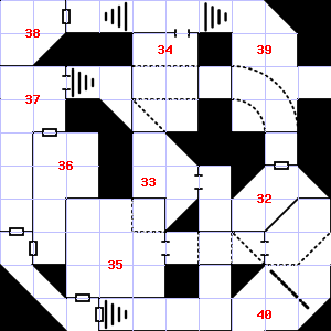 | 37 | 38 | Encounter: Spiders, Crab (3) Treasure: None. | 39 | A strong, gusting wind blows through this area. There is a putrid smell coming from something nearby. Treasure: 500sp. | |