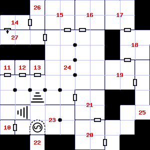 | 22 | There are rotting wood pieces here. | 23 | This area is covered in cobwebs. | 24 | Fog gathers and swirls on the floor, concealing it. This area is very dusty. Encounter: Gnomes (3) Treasure: As per monster type. |