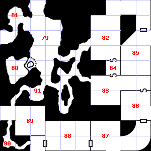| 88 | A slight, damp breeze blows through this area. There are rotting wood pieces here. Encounter: Halflings (9) Treasure: None. | 89 | 90 | The air here is very cold. There is a pile of dung here. | |