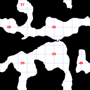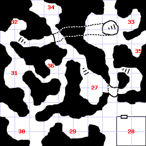 | 31 | 32 | A slight breeze blows through this area. There are dry leaves and twigs scattered here. Treasure: 500sp. | 33 | The air here smells of smoke. | |