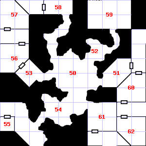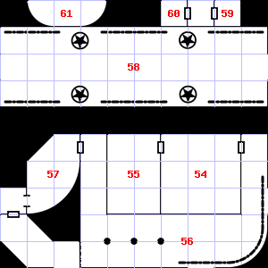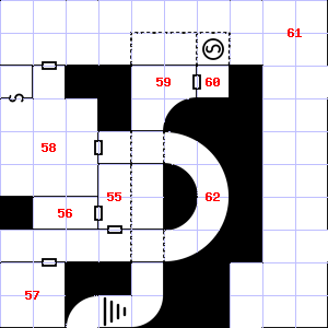| 55 | There is a torn sack here. Encounter: Sprites (12) Treasure: None. | 56 | Trap: Ceiling Block falls: Save vs. turn to Stone or take 1d10 points of damage. | 57 | There is a salty, wet smell to this area. A haze of dust hangs in the air. Treasure: 400sp. |
