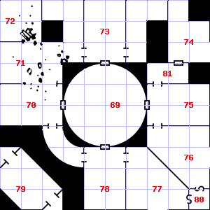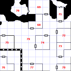 | 73 | A metallic smell assails your nostrils. There is a mold growing here. Treasure: 100sp. | 74 | Encounter: Kobolds (9) Treasure: As per monster type. | 75 | There is a corroded chain here. |
