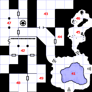 | 46 | A haze of smoke hangs in the air. There is a trickle of water here. | 47 | Treasure: 200sp. | 48 | Your nostrils are overwhelmed by a sulphurous smell. |