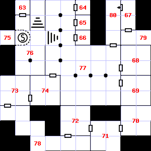 | 22 | The air here is very cold. This area smells faintly of manure. | 23 | This area smells faintly of urine. There are cracks in the wall here. | 24 | An acrid smell assails your nostrils. There are cracks in the floor here. |