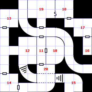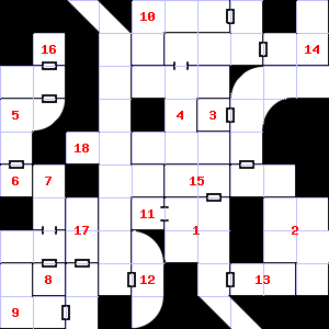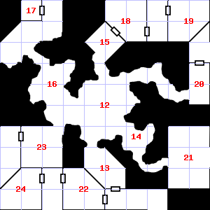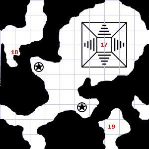 | 19 | This area is covered in cobwebs. Encounter: Sprites (4) Treasure: As per monster type. | 20 | There is dried blood here. Encounter: Wolves (8) Treasure: As per monster type. | 21 | This area smells faintly of manure. A haze of smoke hangs in the air. |