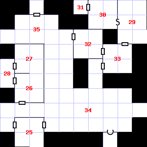 | 25 | The air here is very cold. | 26 | This area has a stale, fetid smell. Fog gathers and swirls on the floor, concealing it. There are cracks in the ceiling here. | 27 | Trap: Chute: No damage, but slide to the next level down (ignore if there is no lower level). |