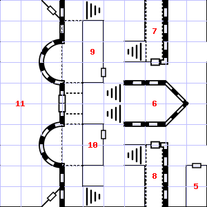 | 10 | A haze of dust hangs in the air. | 11 | This area smells faintly of manure. There is a blunt javelin head here. Encounter: Gnomes (3) Treasure: None. | 12 | A haze of smoke hangs in the air. There are dry leaves and twigs scattered here. |